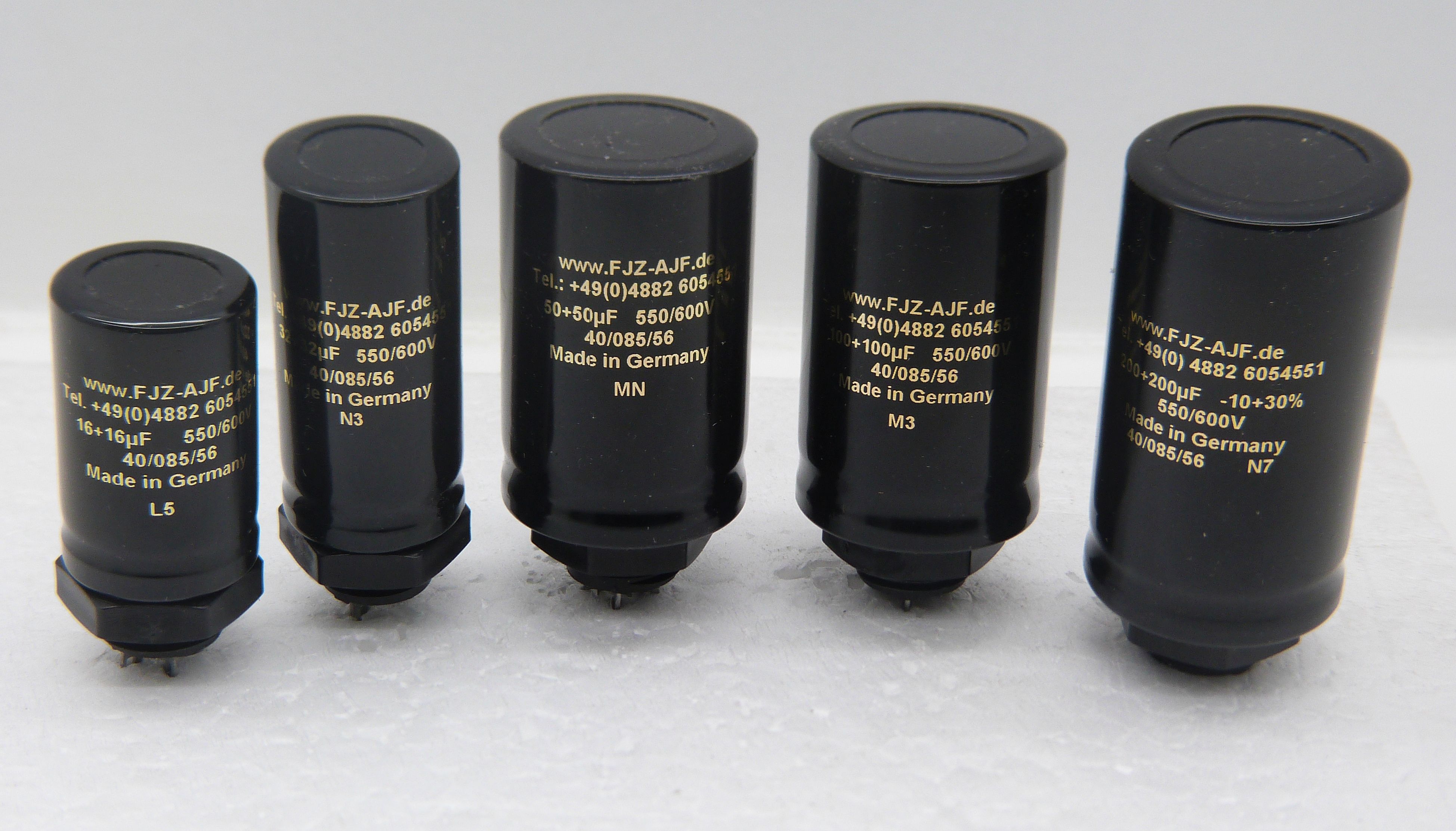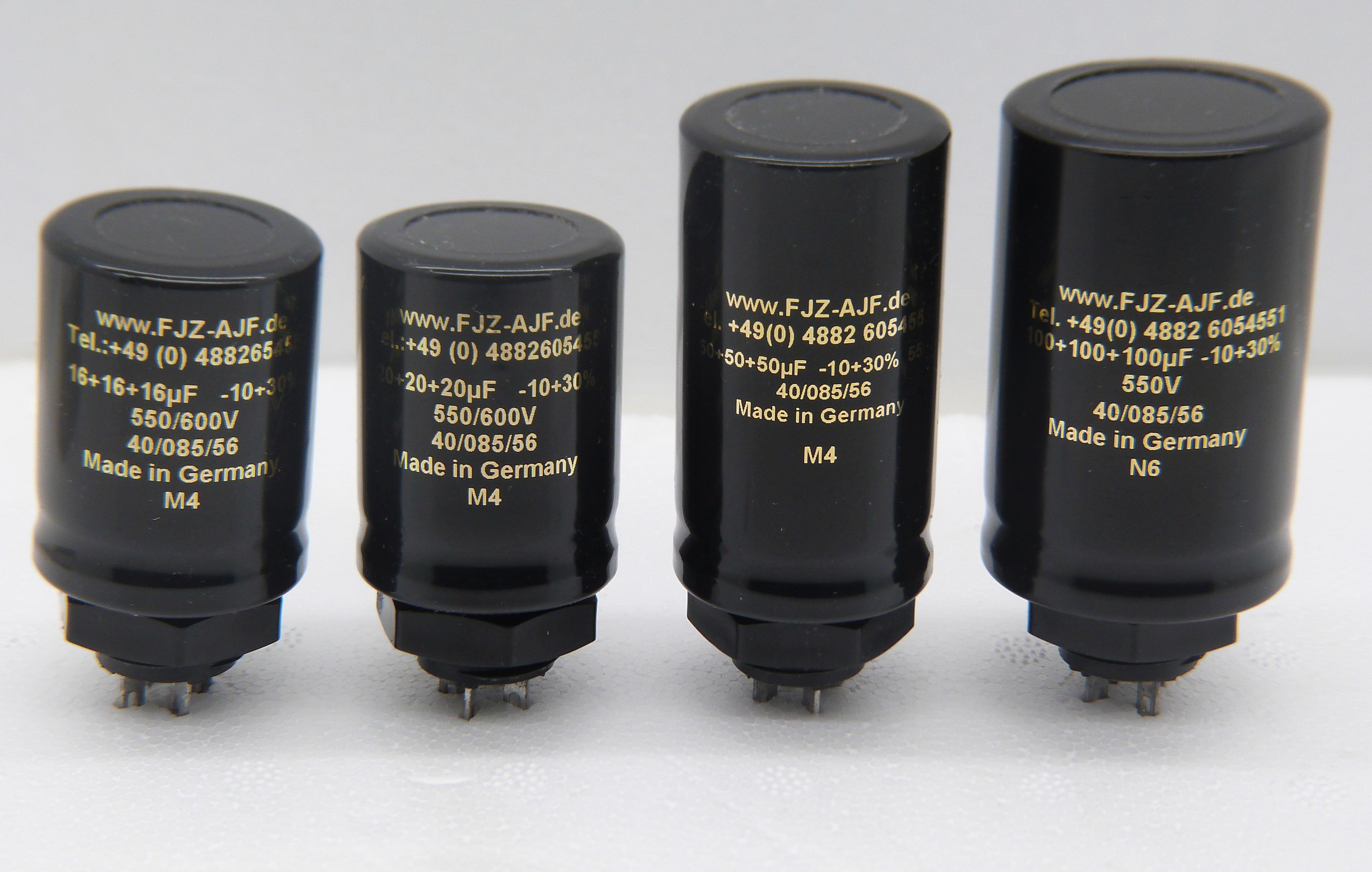 Brand new series, all made in the highest voltage range of 550VWkg / 600V surge, Quality made in Germany. Those caps also replace three-prong twistmounts on compact chassis.