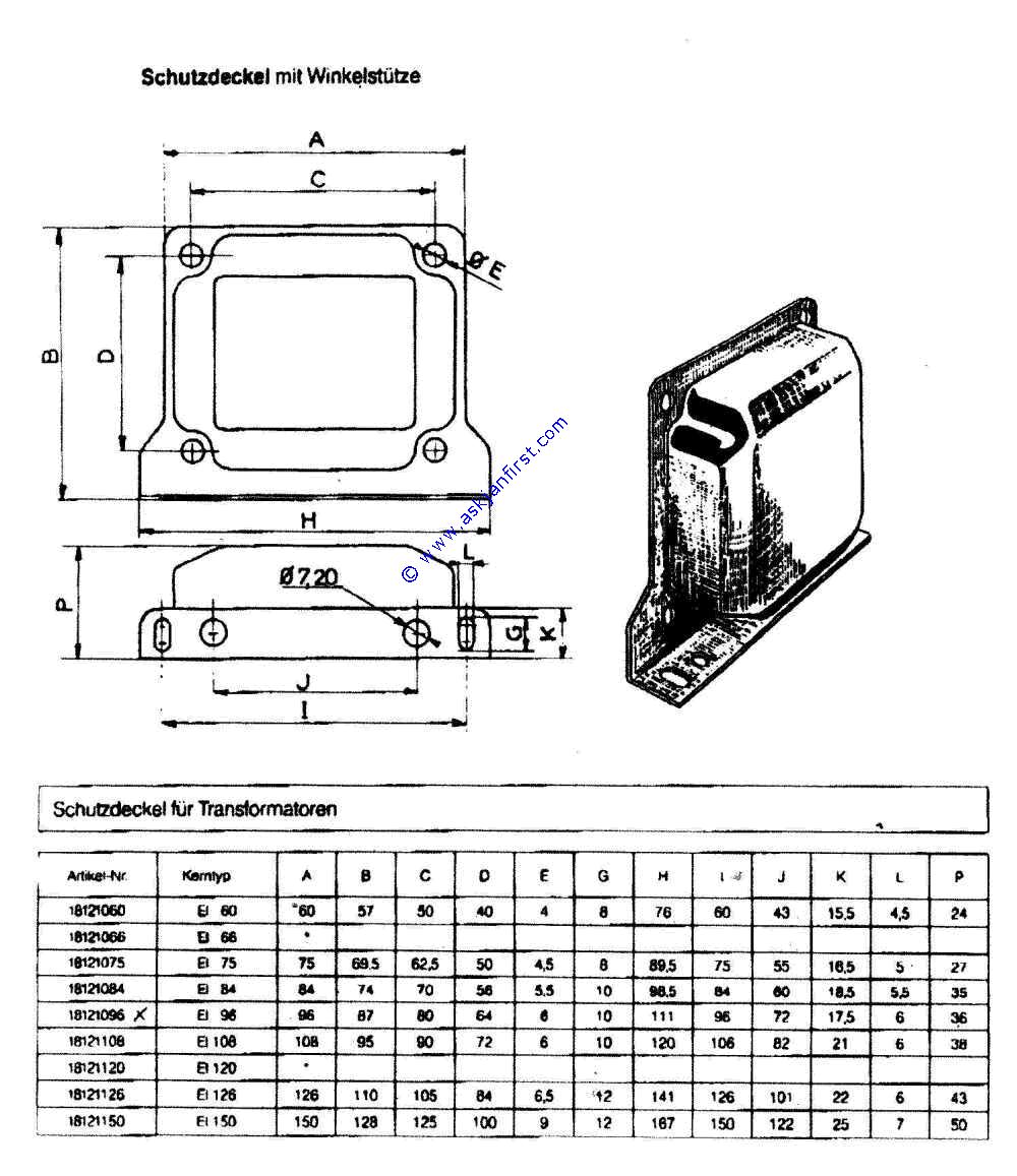 TRAZ06 | Trafoabdeckhaube für EI- Kern. Abmessungen siehe Datenblatt. Größe EI 126. mit Winkelfuß für stehende Montage | Transformer cover, for dimensions see datasheet. Steel, surface treated with mounting foot for upright assembly Size EI 126 | Capot pour transfos, fer, EI 126 | 13,70 | 16,30 |